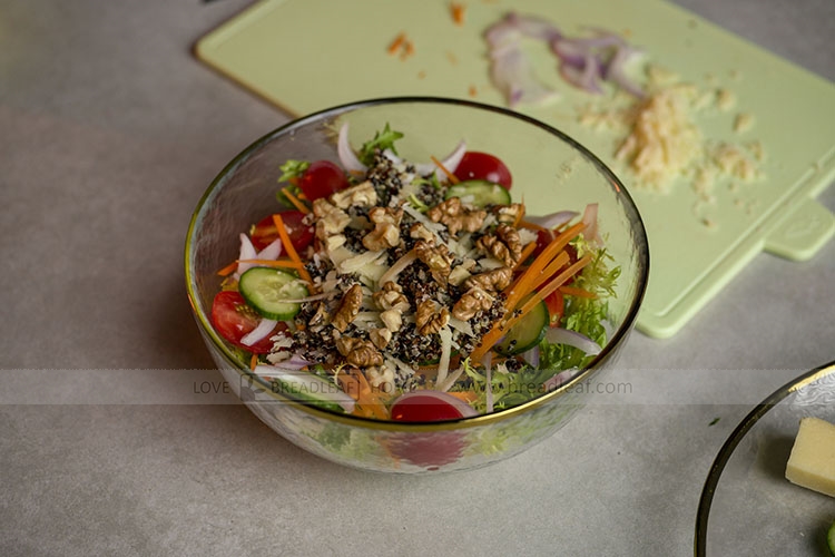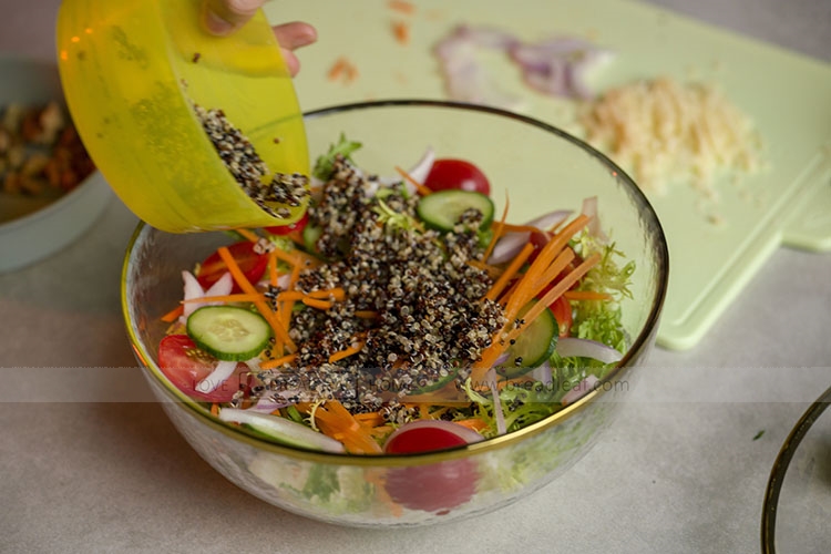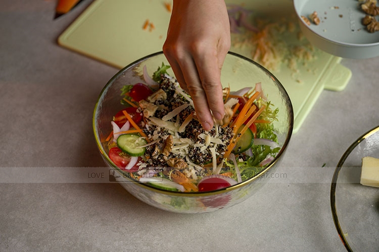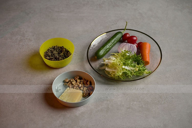 1.首先把蔬菜水果清洗干净,晾干备用。藜麦在滚水中煮沸约10-15分钟左右,捞出备用。核桃仁提前烤熟,放凉备用。