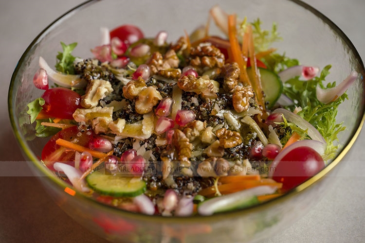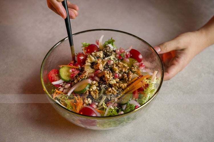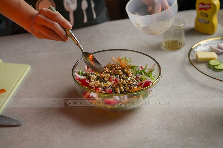 17.把调好的油醋汁均匀的浇在码好的果蔬上面,撒上刚剥好的石榴即可。