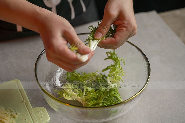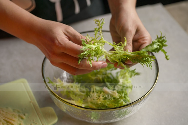 6.把苦菊均匀的铺在碗底(一棵苦菊还蛮多的,我们挑的嫩叶,大概用了半棵)