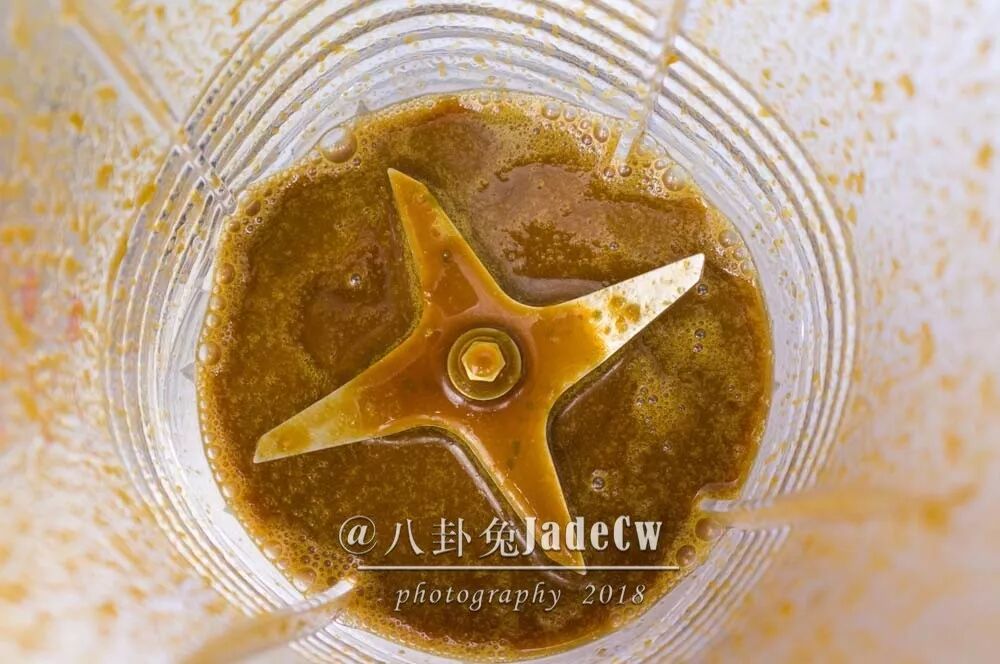 2,B料,放入料理机,打成酱汁。原因除了俺家有人不想吃到葱花姜末外,也使得调料混合(溶解)更均匀,当然你也可以把葱姜剁碎,挤汁等等。按个人条件来。