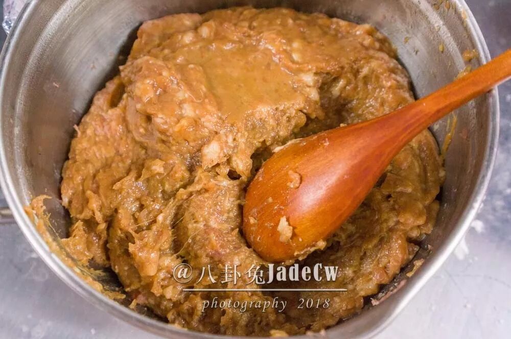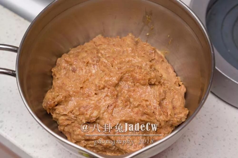3,我是用厨师机搅拌,先把肉馅加入盐,打几分钟至肉馅出现粘性。再低速慢慢的加入酱汁。