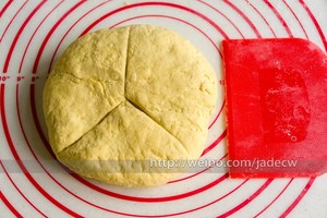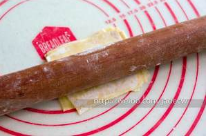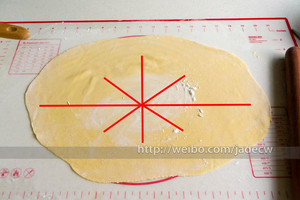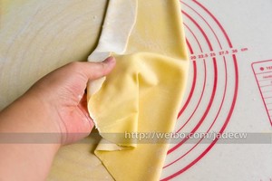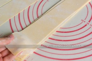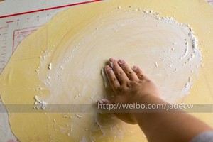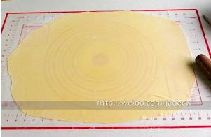 然后就用擀面棍,擀开, 也不是瞎擀,从中间位置开始,沿着腐国旗的方向向外擀。表乱..这样才能均匀展开。