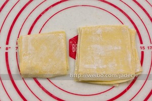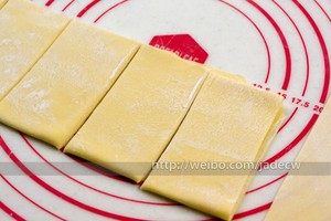 就是宽宽的一条条的。当然手工切不均匀正常。把一端,对齐,叠起来。