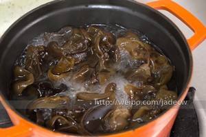 黑木耳泡开后,用开水煮约20分钟。然后切碎。