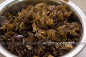 然后再加入菜和木耳。最后倒入虾油,搅拌均匀即可。