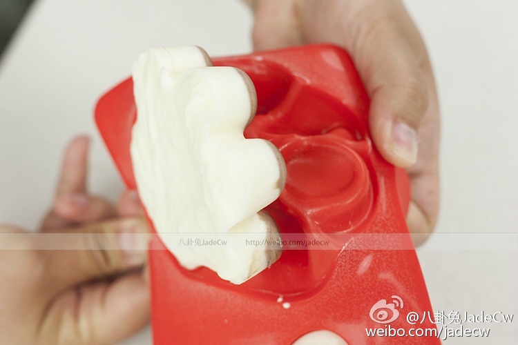 然后倒入模具的小坑中,先冻上一会儿。冻硬之后,再继续用原味填满。