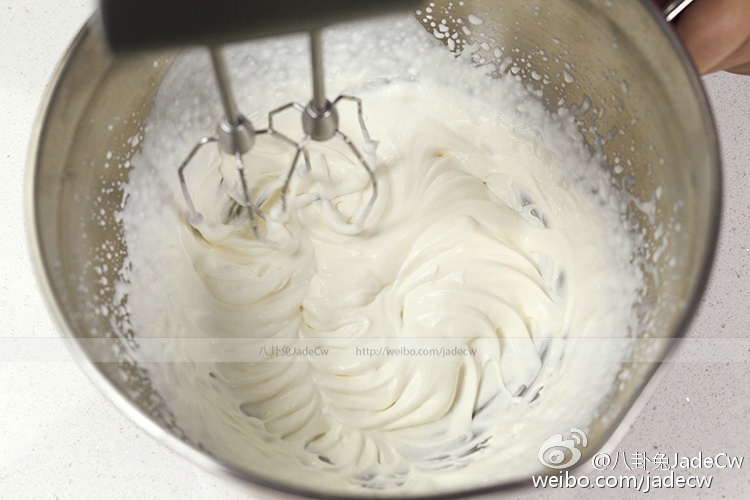 2,把鲜奶油打到6-7份发。流动性降低稍微成型。不需要太硬,不然做出来雪糕不细致。