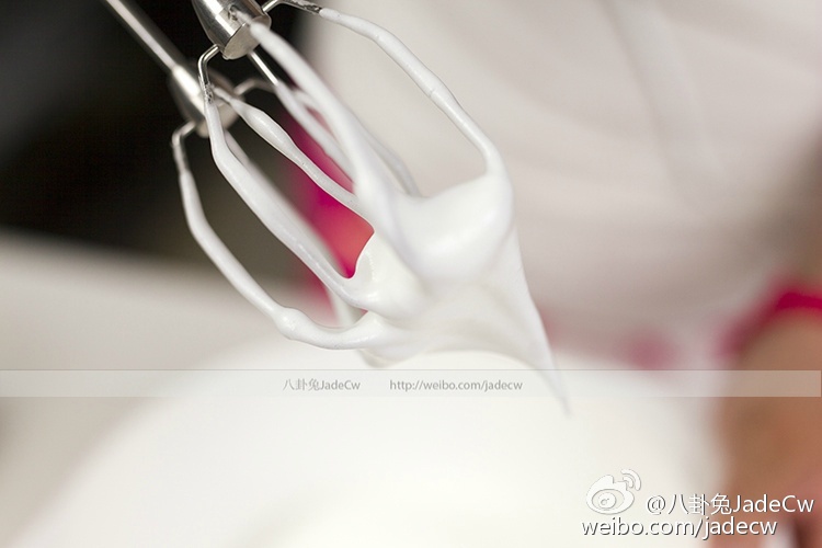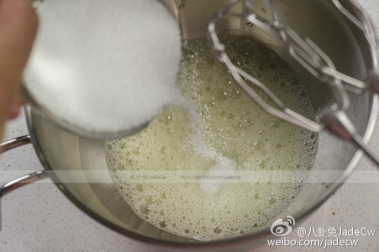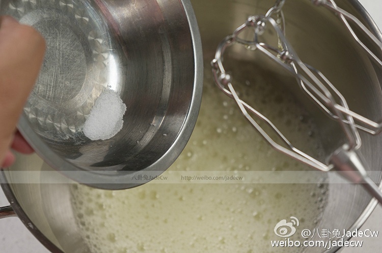 6,蛋白打至粗泡,加入盐,1/3左右糖。
