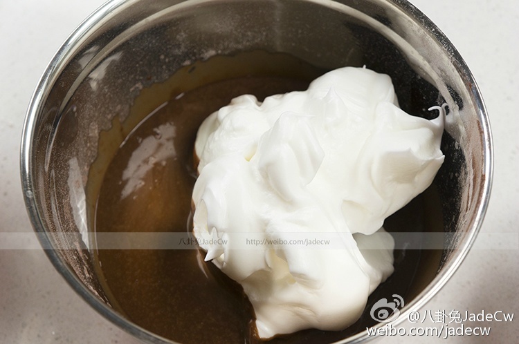 9,顺刮刀倒回蛋白霜中,并迅速拌匀,手法可见上一篇圆润戚风小蛋糕的长微博。