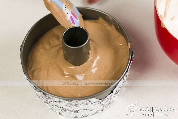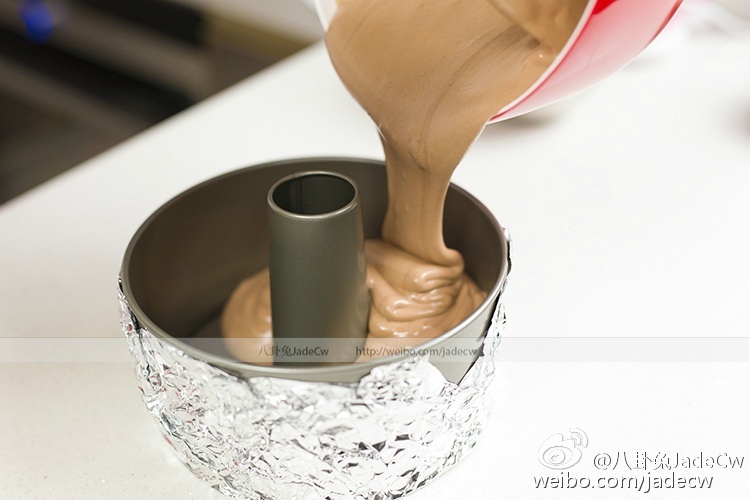10,从一定高度倒入戚风模具中。并用刮刀将表面大致抹平。
