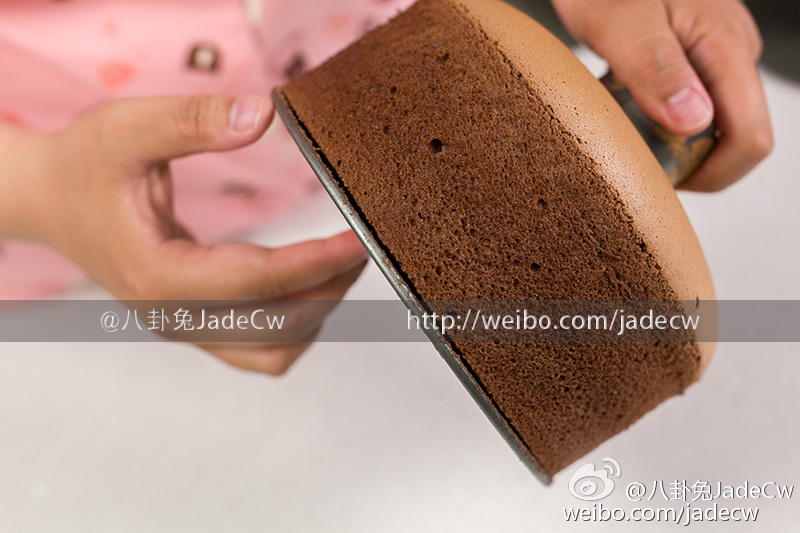 首先,比较简单,一般出炉等一会儿,你抱着模具轻柔摇一摇,蛋糕就自动离模了。可以看到图中蛋糕跟模具有个缝。