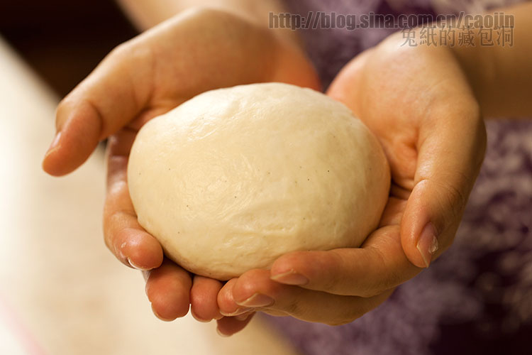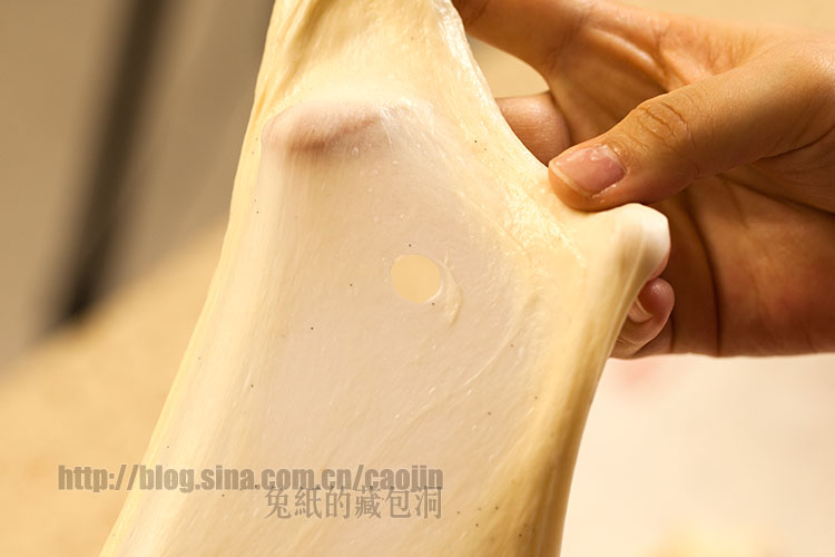 (扩展的标志:面团不再粘手和案板,扯一块面团非常有韧性,能大致拉出薄膜,但不需要很光滑和薄的薄膜)
