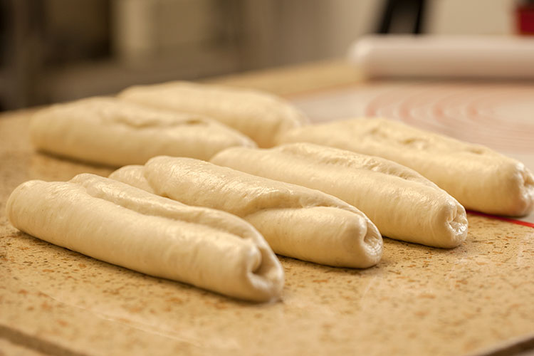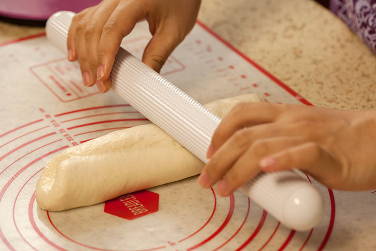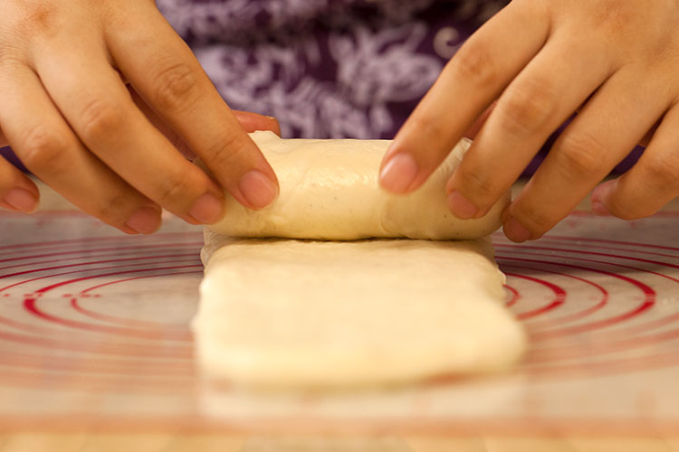 8,松弛完后,拍打面团排气,将面团擀开,并顺势从侧面卷起。卷好后继续松弛约10分钟样子