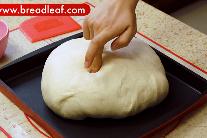 一般发到,手轻压,慢回弹一点,模具内9分满(如果带盖可能是7-8分满)不要在面团表面戳,找个不起眼的位置。有经验以后不要戳,影响品相哦。