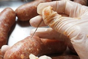 10.打结排气:可以全部灌完整根肠衣,也可以边做边打结。就是把肉撸一撸,让肉紧致一些,然后每隔一段留空,用棉线扎起来(很多时候不需要扎也行,但是我是处女座嘛~~)注意撸的时候不要太用力,有空气的地方可以适当用针戳一下,排出空气,让肉压紧。但是也别挤爆掉啦。一般每节香肠最多扎个2-4下就好,不要容嬷嬷上身哦~~~O(∩_∩)O