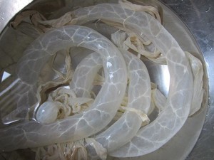 1.猪肠衣实在是很粗的,所以我一般都喜欢用羊肠衣。提前一日或者半日,用清水侵泡去掉盐分再泡软洗净,你问我肠衣哪里买,当然是万能的首(tao)富(bao)网啊~