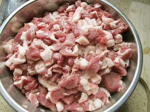 3.最艰难可怕的事情就是:切肉!把猪肉都切成小块,对,不是绞碎,所以绞肉机是不成的…因为我们做的不是哈尔滨红肠,是腊肠,所以都要一块一块的。肥瘦根据自己喜欢,3:7分,还是5:5分,随便你