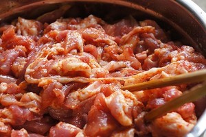 7.撸起袖子,抓肉吧。好好给肉做马杀鸡~抓匀腌料,然后放冰箱冷藏,腌制小半日。看个电影或者睡个午觉去吧~