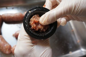 9.把肉一点点压进漏斗,随着肉一点点挤入,肠衣也会一点点随着肉顶出来(图片不是当次拍的,是做其他肠,但是手法完全一样哈)也可以用几根筷子一起,但是切记不要太用力戳,戳破肠衣的话前功尽弃啦。