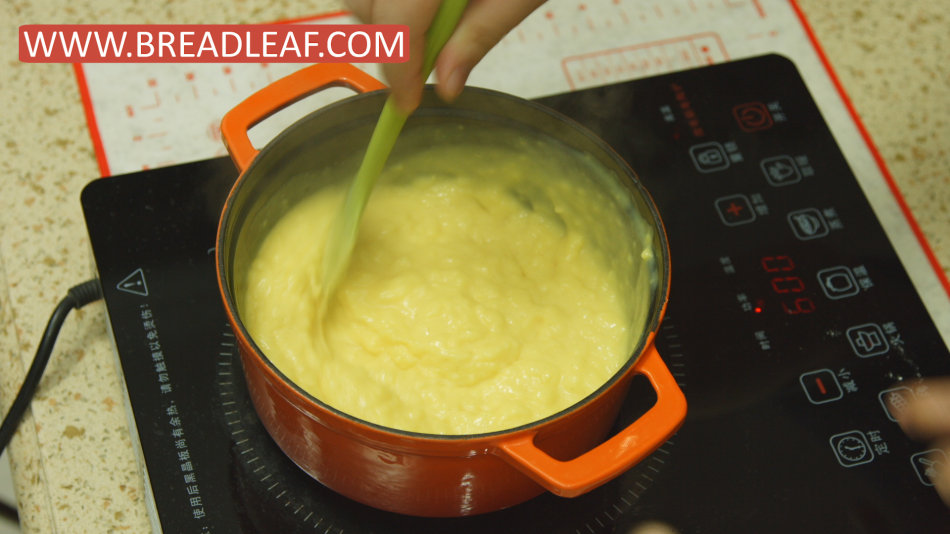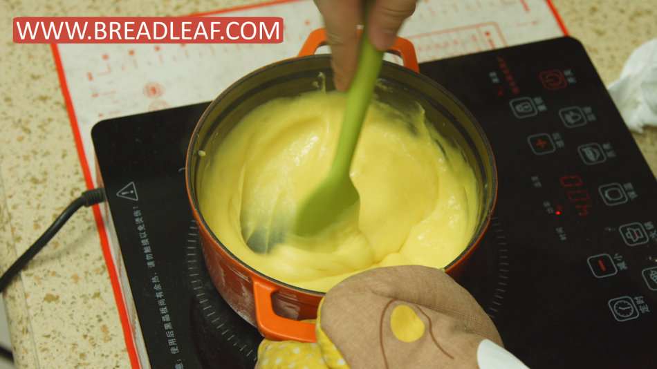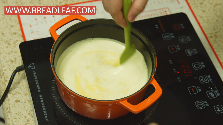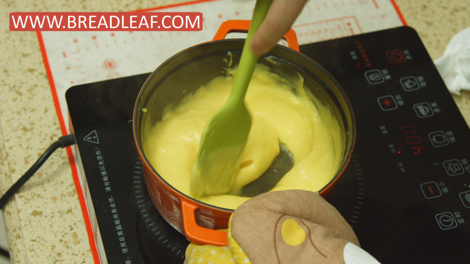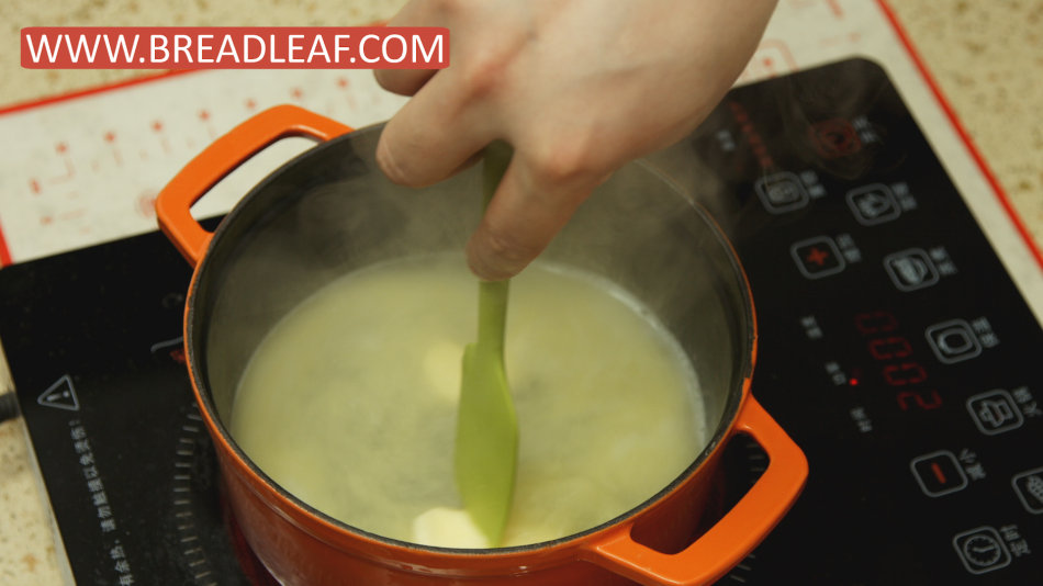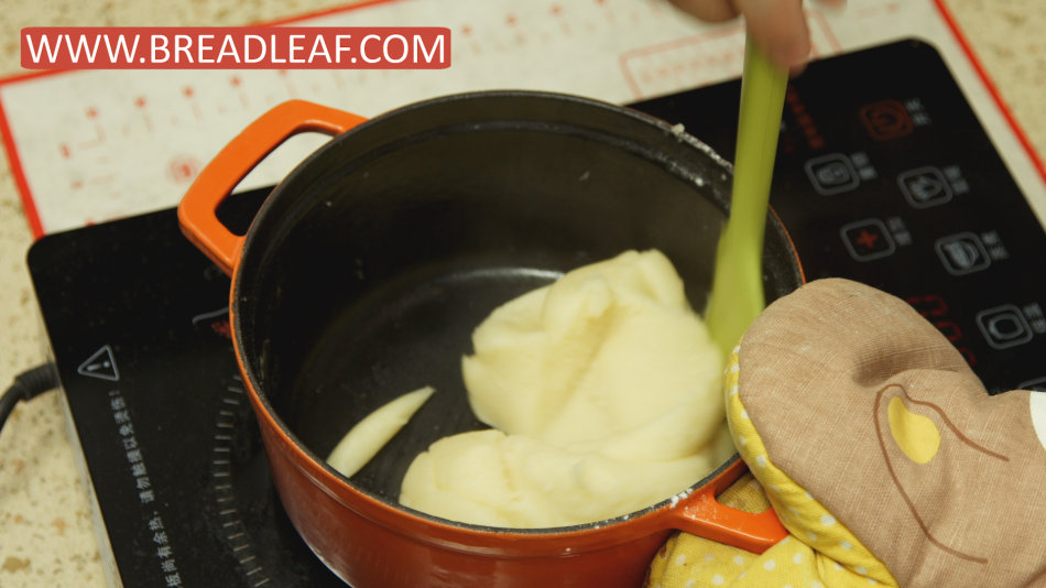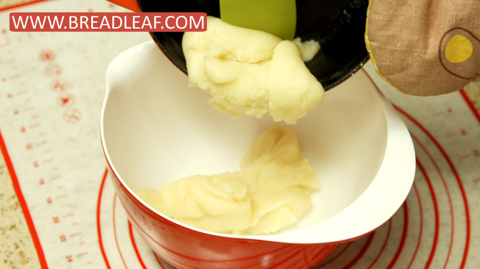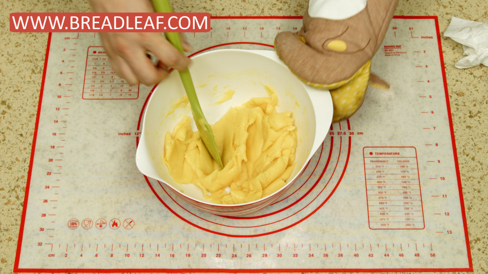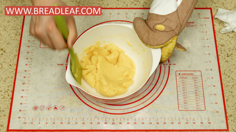 1.把水倒入锅中加热,加入盐和黄油。然后一边加热一边搅拌。加热到沸腾以后,从火上移开锅,停止加热。筛入低筋粉。搅拌面糊到成为一体以后,再到火上继续加热。一边加热一边搅拌。直到看到锅底有薄膜以后,停止加热,面糊准备完毕。我一开始感觉,哇,这个很复杂,一会加热一会不加热。其实很简单。原理就是为了糊化。移开热源,也只是希望把整个面糊搅拌均匀后继续加热糊化。理解到实际的目的,就很容易理解了。