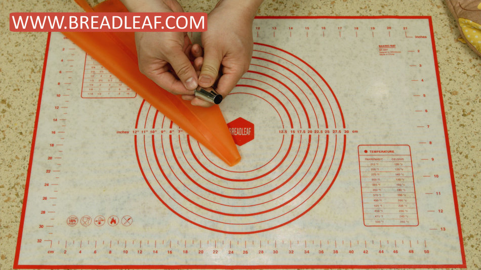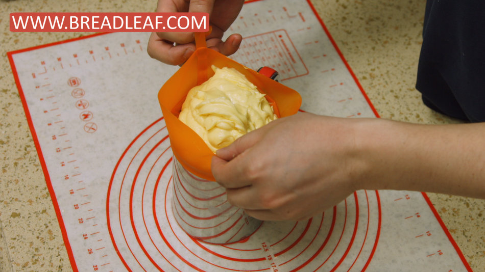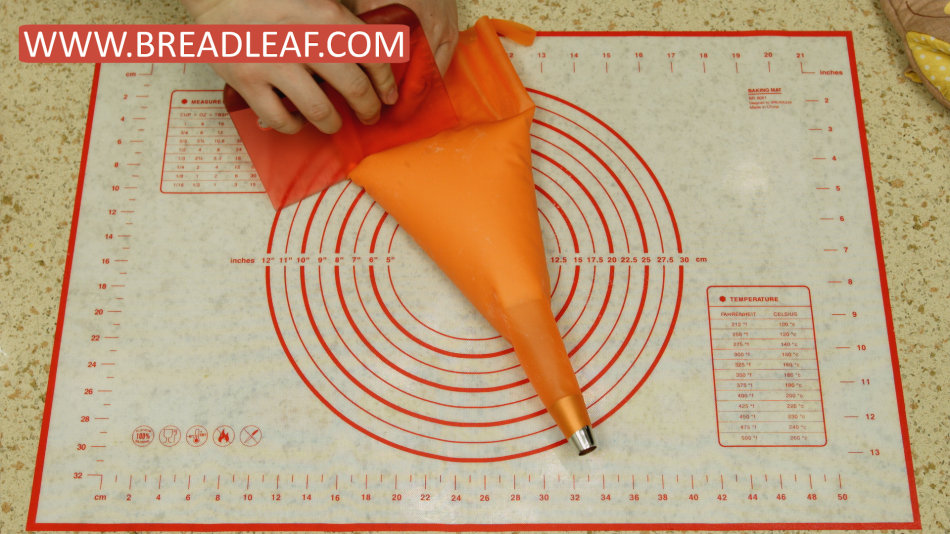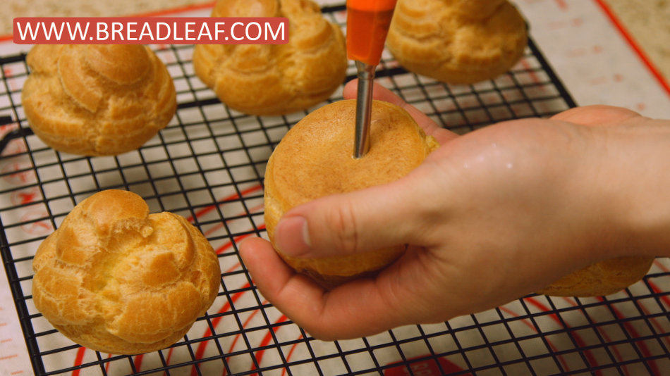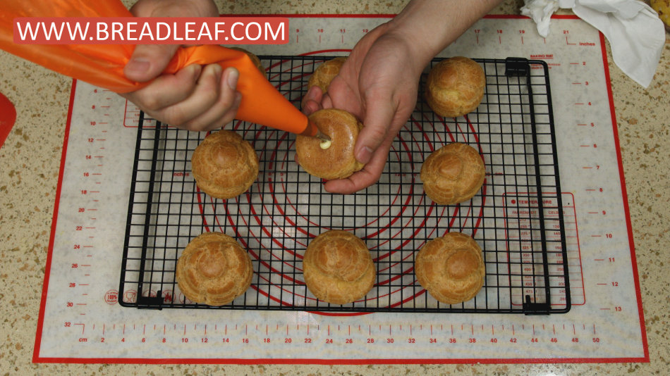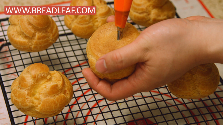 5.把用来注射蛋奶沙司酱的泡芙嘴(一种长管头的裱花嘴)装到裱花袋上。然后把蛋奶沙司酱装到裱花袋里。用刮板稍微往前面挤压一下蛋奶沙司酱糊。从冷却的泡芙的下面把蛋奶沙司酱注入进去。感觉像给泡芙打针一样。一边注射,一边可以明显感觉到泡芙变重。感觉很好玩。