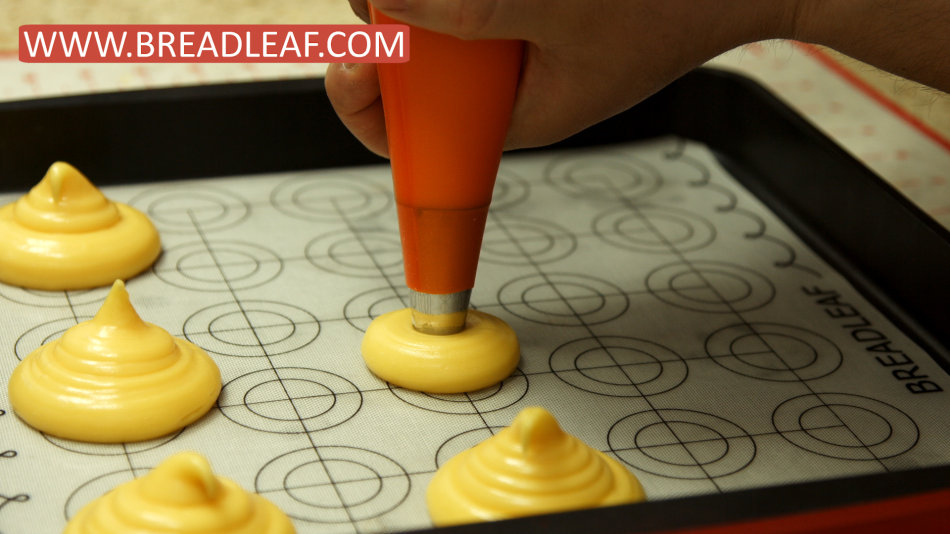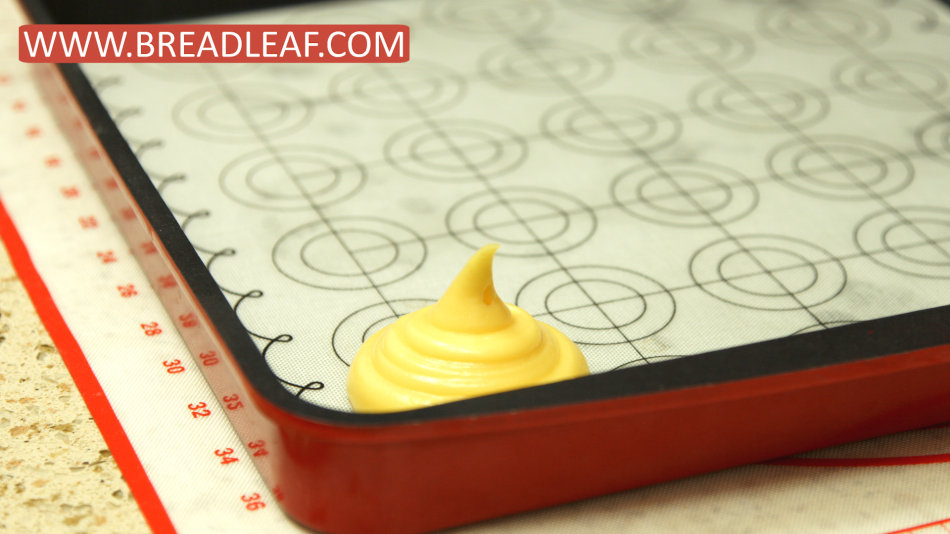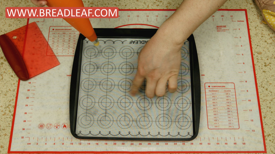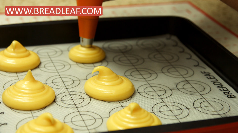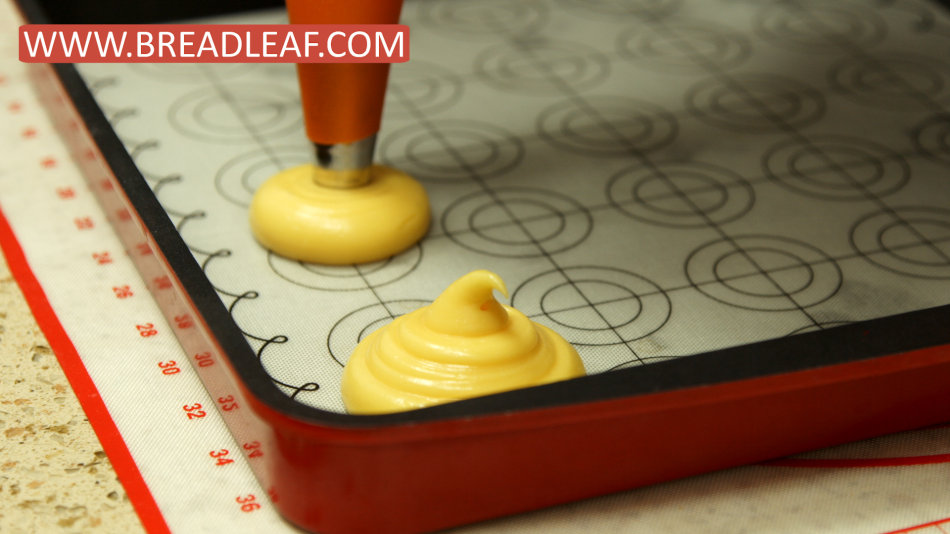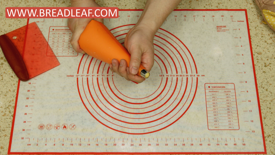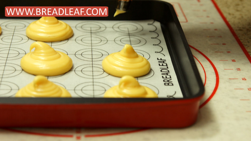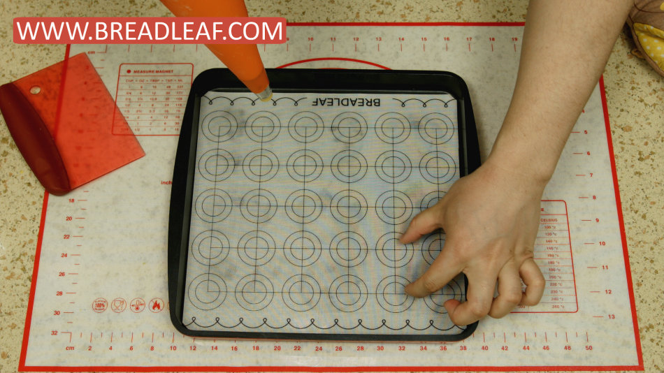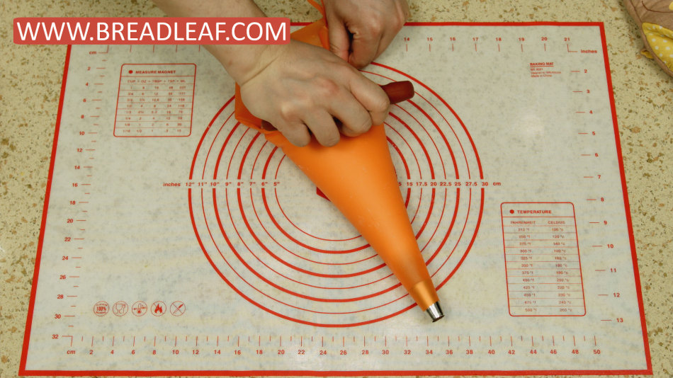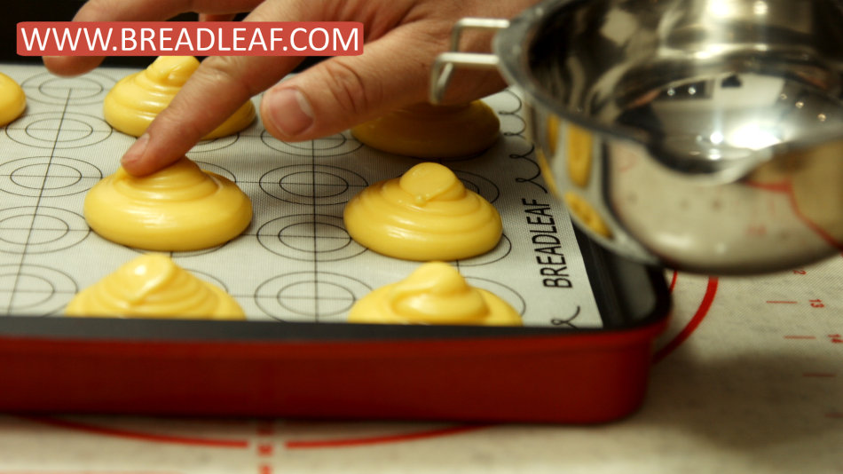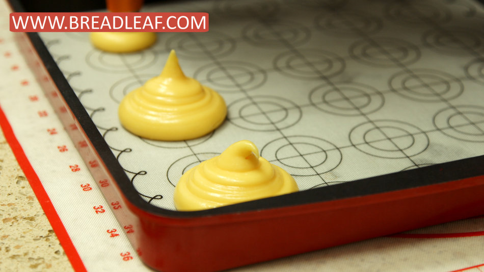 4.在挤之前,先规划一下。我们要做的是大泡芙。大概挤4.5厘米。和曲奇垫上的正方形线的边长差不多。所以可以利用正方形的边长来参考。我用手比划了一下每个泡芙面糊的位置。先侦察一下。然后开始挤,其实很容易,裱花嘴基本不要动,一边挤一边稍微垂直往上面移动一点点就够。收尾的时候,在上面的手停止供液。(就是不要挤压裱花袋子了)然后快速移开,就又一个很漂亮的收尾了。但是兔子麻麻路过,她说你做的这个啥玩意儿啊。看起来像小豌豆的便便。我说这个可是高大上的外国泡芙哦:当年嫁到法国的奥地利公主婚礼上的,还带来了欧洲和平…麻麻可没心思听这个,还是像便便,走开了。我继续做,用手指蘸一点水,把顶上那个触角按下去,也就是最像便便的那个触角。