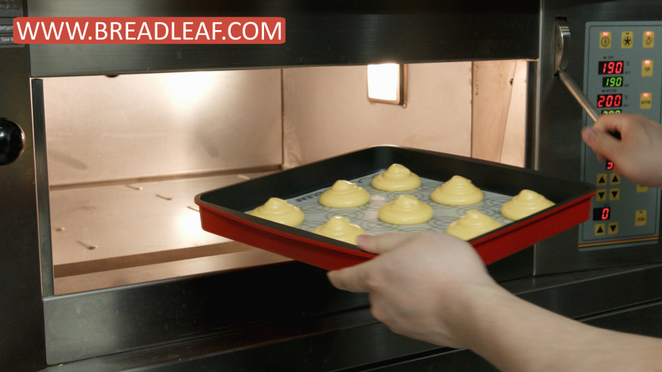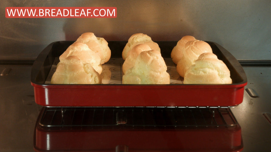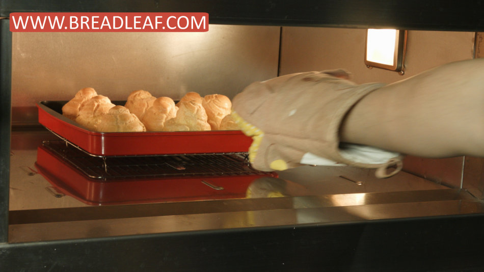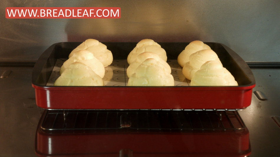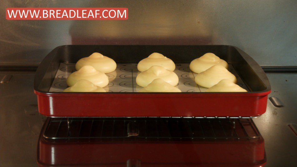 5. 烤箱上火月190度,下火200度。按预热温度烘烤。等到膨胀鼓起后,调至上火180度,下火160度。为什么呢?因为一开始上火小,是要让泡芙充分膨胀。不要一开始就把泡芙上面烤焦掉了。如果要是完美主义者呢,可以完全膨胀以后,稍微调高上火,同是调低下火。我图方便,就是2个阶段烤的。效果也还不错,涨的很高。烤的过程大约45分钟。
