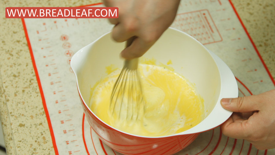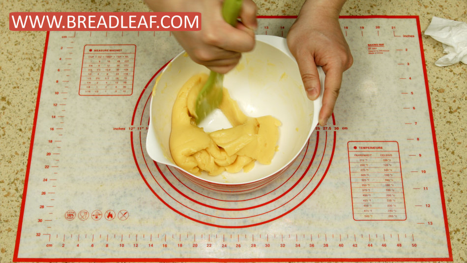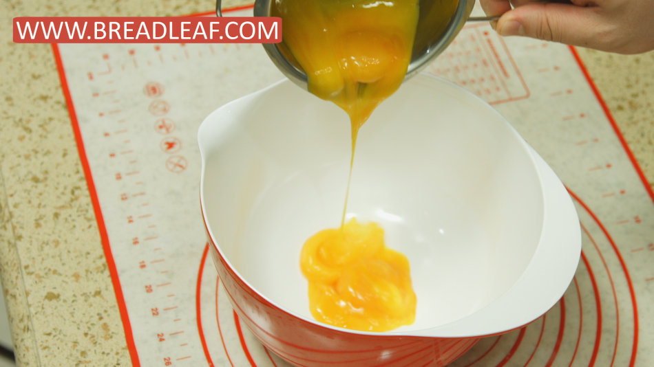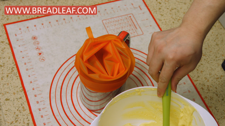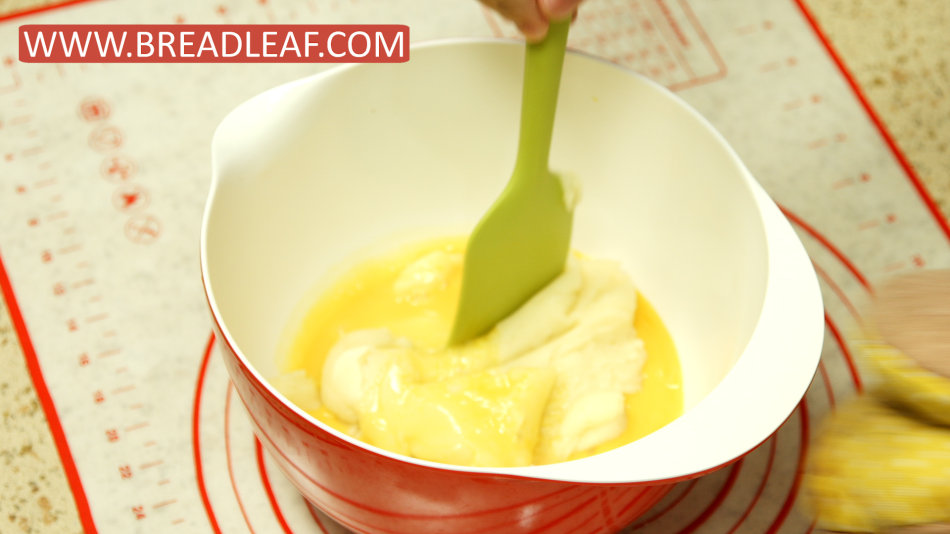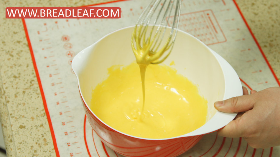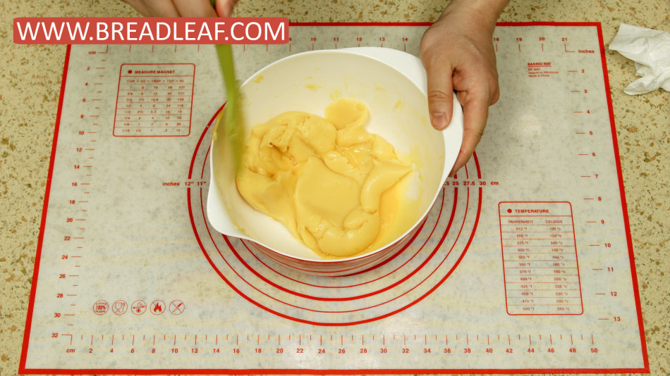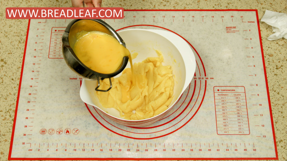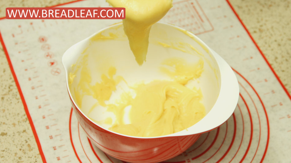 2.把面糊转移到打蛋盆中,然后加入一半的蛋液。第一次面糊温度高,可以加入一半。试验了效果挺好。加入蛋液后搅拌。搅拌均匀以后,再加入一汤匙左右的蛋液。后面要每次加少一点,因为溶解比较前面难。所以耐心一些。我后面分了大约5次。其实也很快。总共3,4分钟左右。搅拌均匀以后,面糊在刮刀刮起来后,会有倒三角状态。这个是很好的兆头,说明糊化的效果比较理想。当时看到这个倒三角,心里很非常高兴啊,比中彩票还高兴呢。