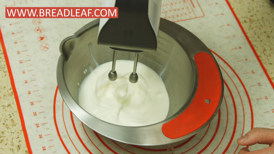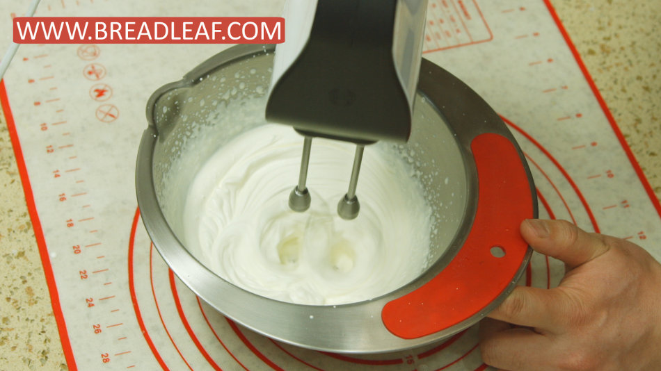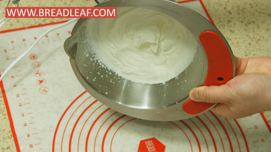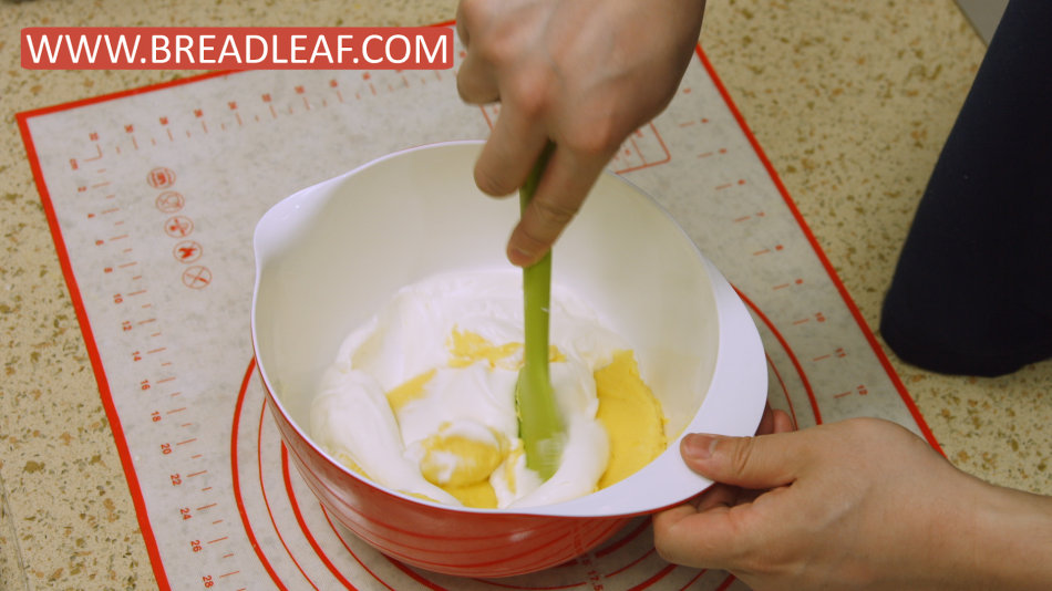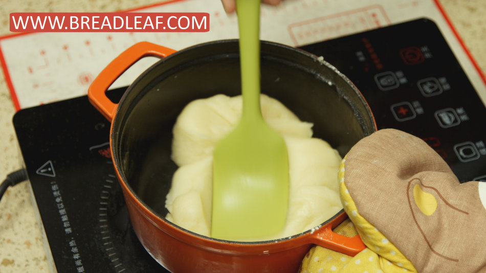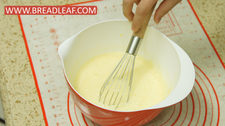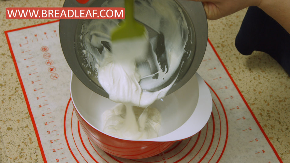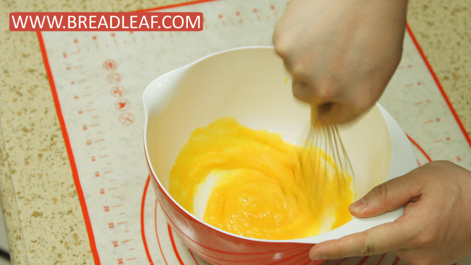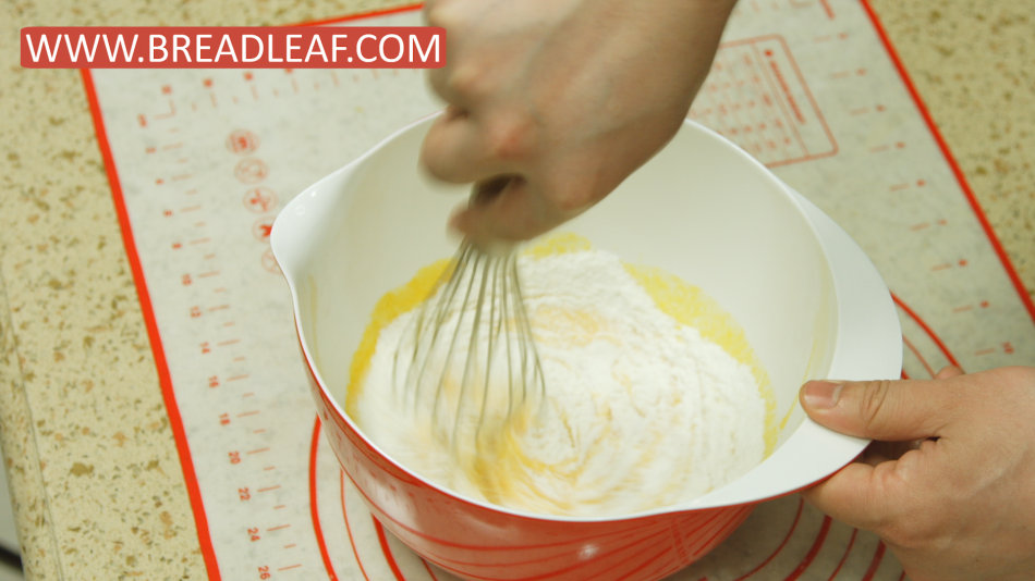 2.把面糊转移到打蛋盆中,然后加入一半的蛋液。第一次面糊温度高,可以加入一半。试验了效果挺好。加入蛋液后搅拌。搅拌均匀以后,再加入一汤匙左右的蛋液。后面要每次加少一点,因为溶解比较前面难。所以耐心一些。我后面分了大约5次。其实也很快。总共3,4分钟左右。搅拌均匀以后,面糊在刮刀刮起来后,会有倒三角状态。这个是很好的兆头,说明糊化的效果比较理想。当时看到这个倒三角,心里很非常高兴啊,比中彩票还高兴呢。