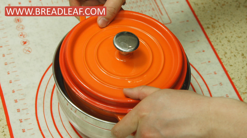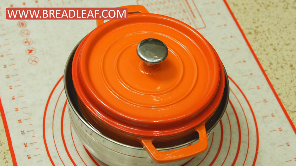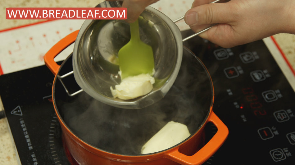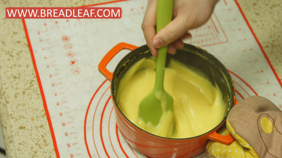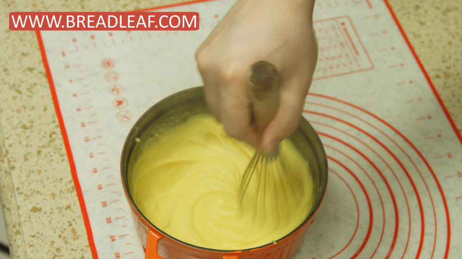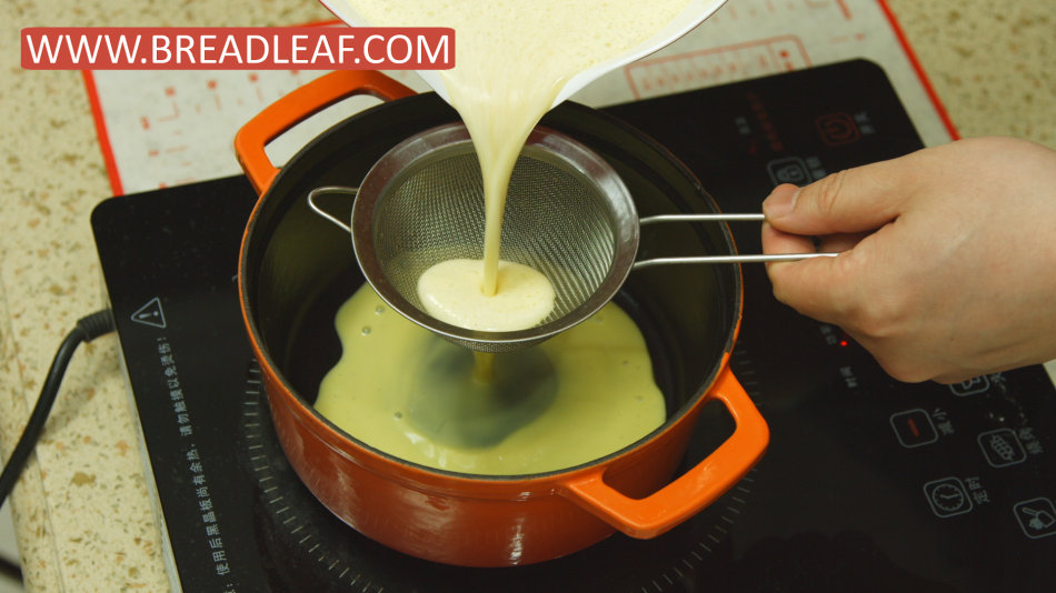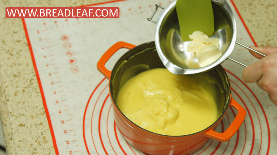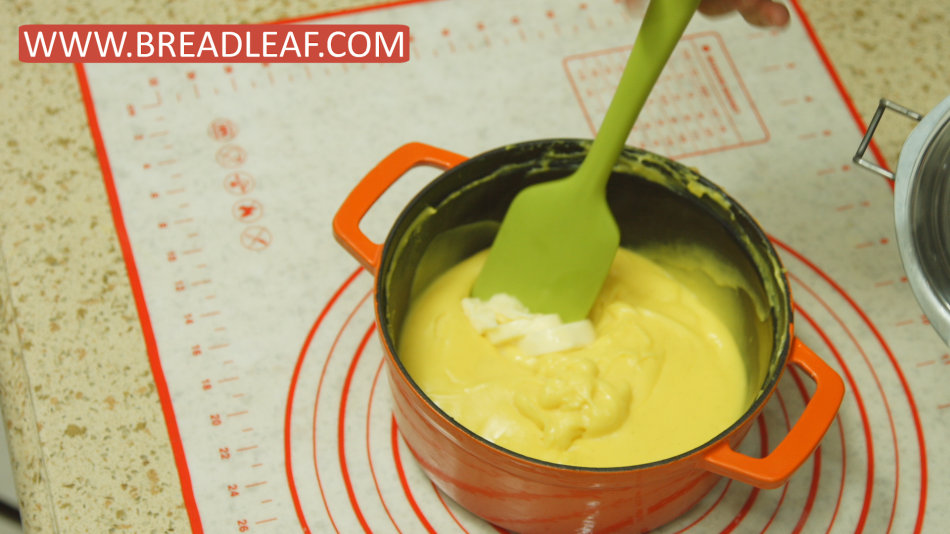4.把混合好的溶液,过筛倒入锅中。然后一边加热,一边搅拌。慢慢的会变成糊状。到锅底有薄膜后,就是糊化好了。移开热源。把黄油倒进去。用余温熔化就可以了。用刮刀把黄油搅拌均匀。然后要急速冷却。我想了个办法,把大的打蛋盆里放一些冷水,把整个锅放进去,盖上锅盖,防止水分散失。不盖盖子容易水分散失。把淡奶油打发一下,我把淡奶油打得稍微硬一些。就是dairy queen那种倒杯不洒的状态。然后把冷却的蛋黄液和淡奶油混合,搅拌均匀。