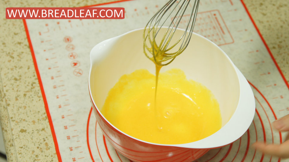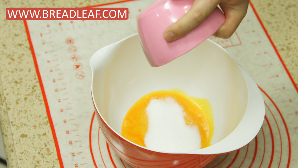 2.把鸡蛋倒入打蛋盆,然后加入2/3剩余的白砂糖。用手动打蛋器搅拌均匀。稍微搅拌一下就可以了,不用打发。