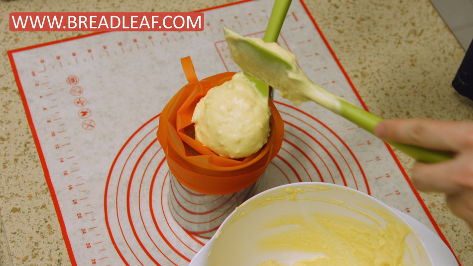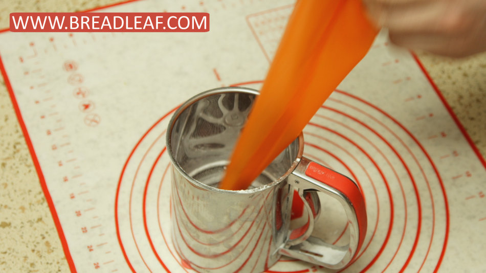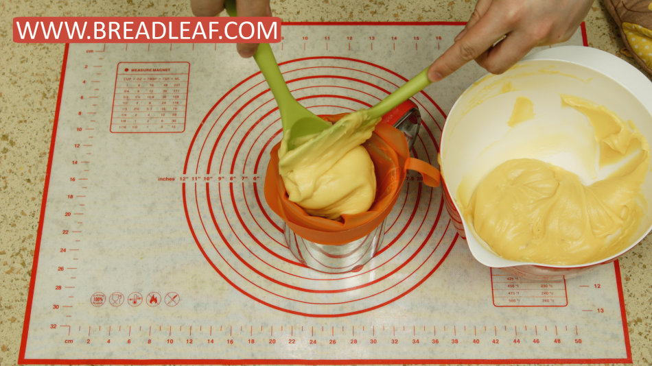 3.挤泡芙需要一个圆口裱花嘴。装到裱花袋里。然后把裱花袋套在面粉筛上。(也可以用个大杯子)然后把裱花袋撑开一点,这样把面糊往下面塞塞。我用了一个硅胶锅铲来铲面糊。这样一次可以多装一些。而且方便。以前兔子总是说我转移面糊笨手笨脚。你看,我还不是很笨对不对?然后用硬一些的刮板,往前面挤压面糊。看到裱花嘴上出一点点面糊就好了。