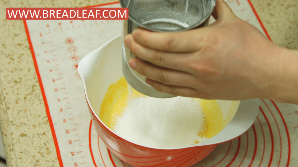3.把玉面淀粉倒入面粉筛,我原来就把低筋粉放在面粉筛里的。然后一起筛入搅拌好的蛋黄里。用手动打蛋器搅拌均匀。把香草牛奶倒进去。搅拌均匀。