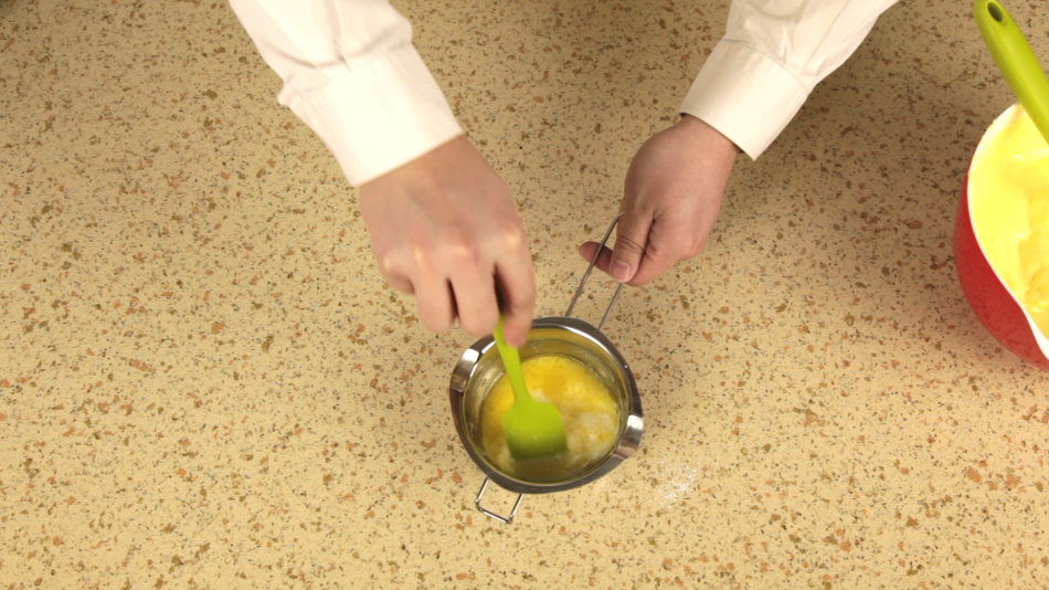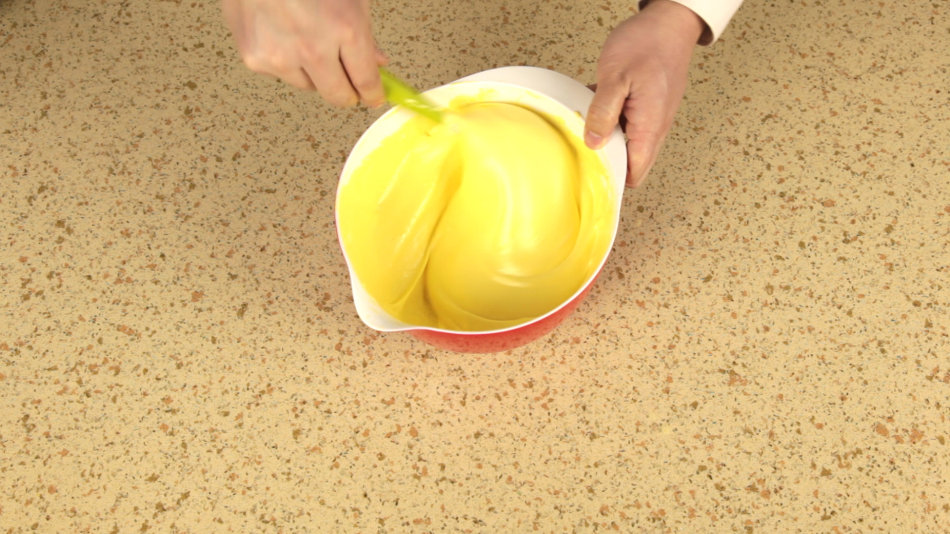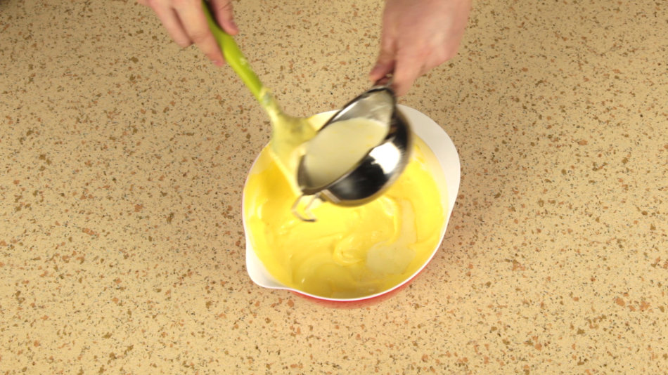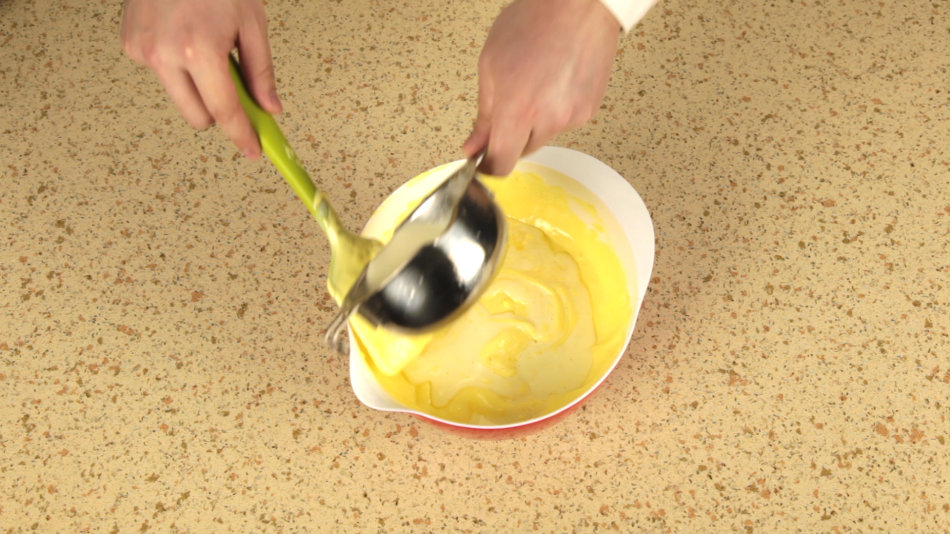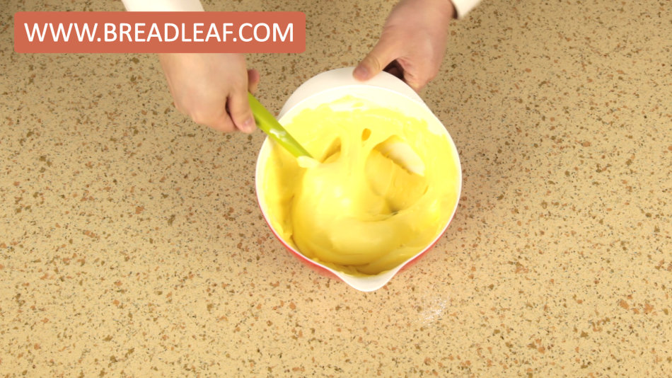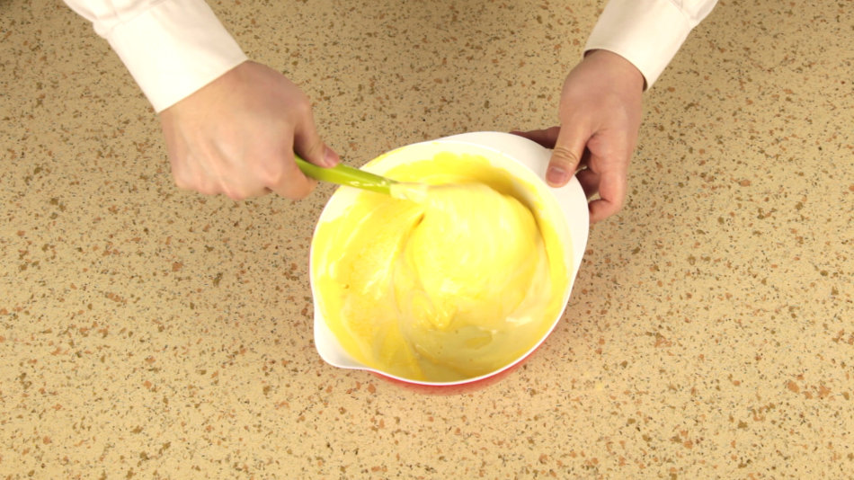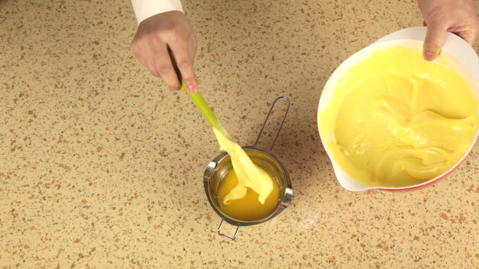 第五步:从打蛋盆里,把第四步中打好的蛋液里,用大刮刀,刮一刀份量的蛋液,放到“黄油:26g”和“椰汁:36g”的混合液中。然后继续“Z”字形混合,有时候有一些蛋液小团团或者小疙瘩,可以用小刮刀压一压。这些蛋液是准备牺牲掉的,因为他们进去就消泡了。感觉他们是我们这里叫“媒子”,在北方应该叫“托儿”,呵呵,在国外也许应该叫“Media”,是一种媒介,可以让本来不太容易和蛋液混合的黄油和椰汁,比较容易的和蛋液混合。属于蛋液的先锋队吧。感谢他们的牺牲。