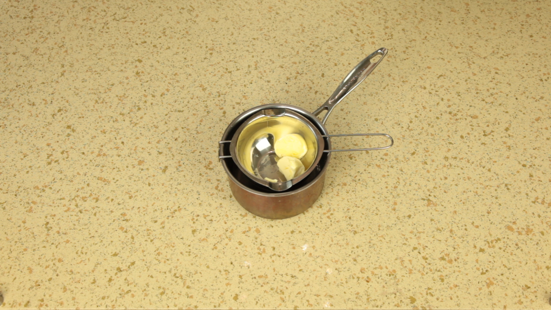 第一步:为了节约时间,和避免后来打好蛋液不消泡。提前用一个小锅融化一下“黄油:26g”。我是用的一个可以架在锅上的小加热碗,锅里放一些水,放在炉灶上用小火,稍微加热一下。黄油就会很好的融化了。如下图: