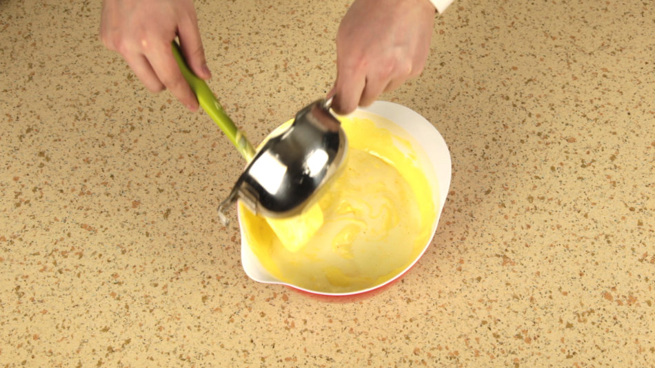 然后,把混合好的液体,倒入打蛋盆中。倒的时候,均匀的撒在表面,四周和中间都分布到。还可以用大刮刀,稍微阻挡一下,起缓冲作用。因为黄油和椰汁的混合液比较重,如果冲击猛,进会一下子沉入底部,不利于后面混合了。如下图: