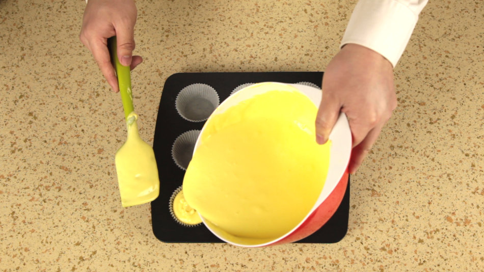 第七步:把上面混合好的液体,从打蛋盆中倒入模具。我在每个杯子里放了一个小纸杯。这样做好了比较好保存和移动。在倒的时候一般需要离开模具10厘米。我的感受:因为打蛋盆有一个小豁口,倒的时候稍微慢一些,在经过豁口的时候,蛋液中残存的大气泡和中号气泡也会破掉,因为倒的时候液体的深度浅,大一点点的起泡就破裂了。