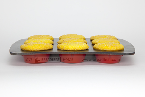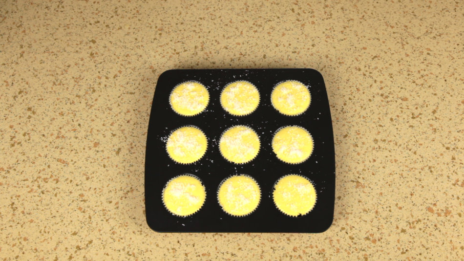 然后,撒一些椰蓉在每个马芬上,可以根据个人喜好。我发现其实多撒一些是更加好的,因为椰蓉烤过了是金黄色的,味道也更佳。如下图: