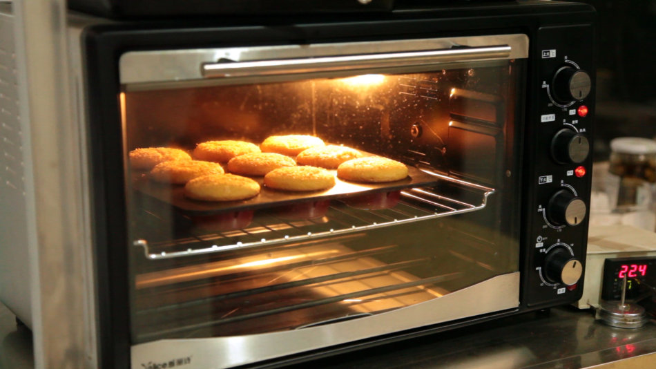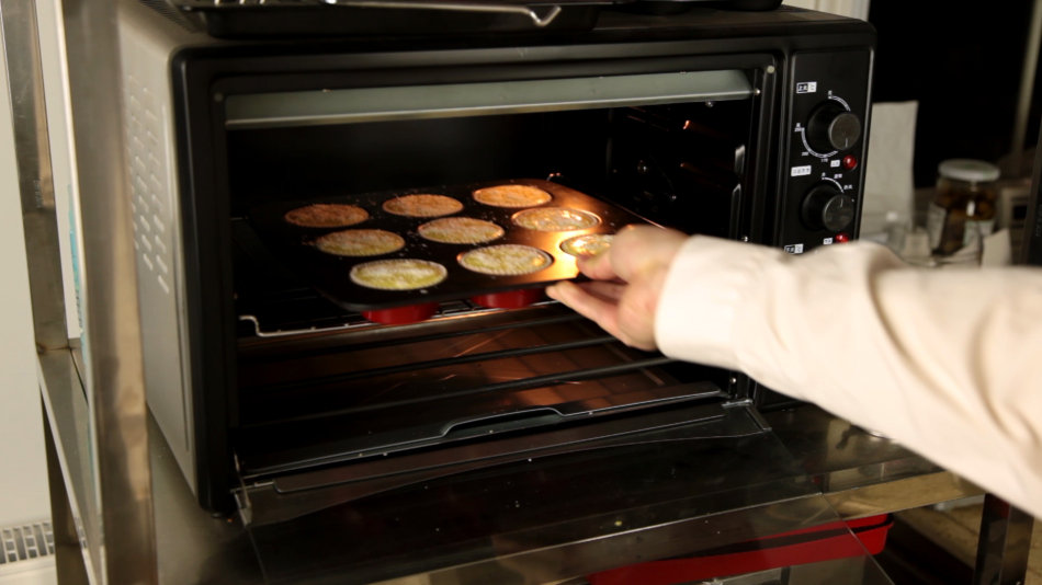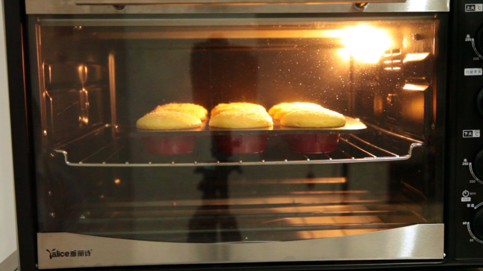 第八步:把烤箱温度调整到170度,烘烤25分钟左右。在最后5分钟的时候,站在烤箱旁边看烤箱里的蘑菇头,当四周成为焦黄色的时候,立刻出炉。这样做出来的四周脆,中间软,吃起来比较好吃。如下图: