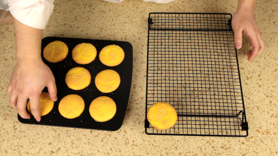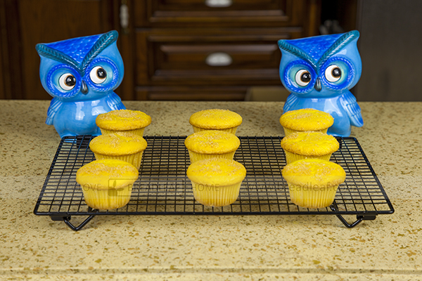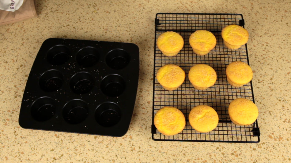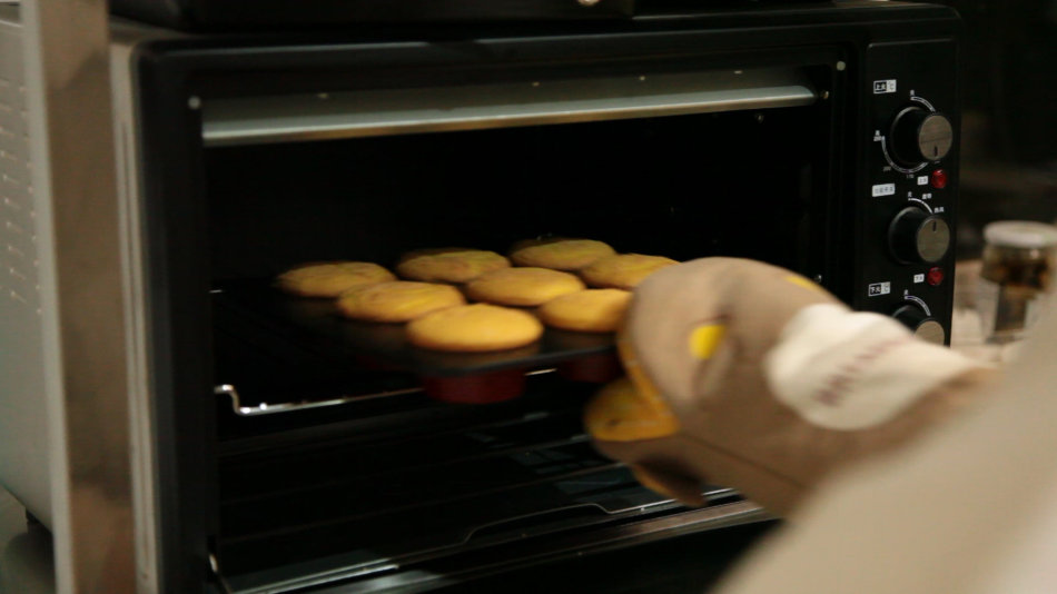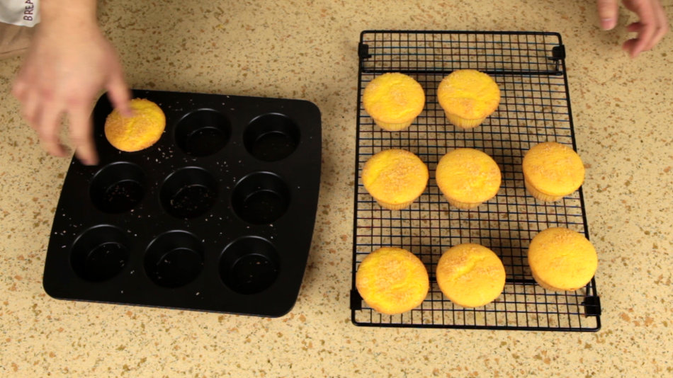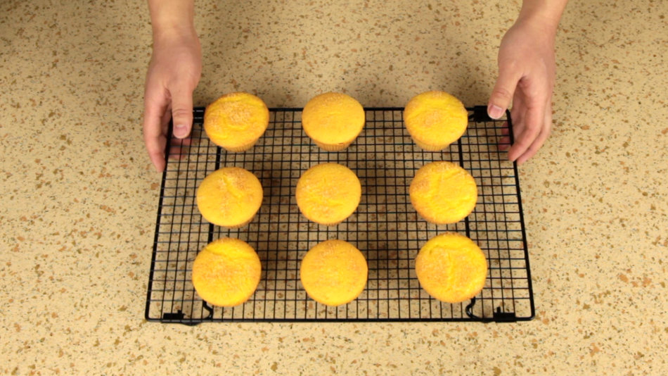 第九步:把出炉的模具震动一下。因为有纸杯,一般马芬蛋糕自己就跳出来一点点。大约等20-30秒,蛋糕表面就冷了一点点,直接就可以用手拿出来了,放在旁边的晒网上。注意动作快一点,不要碰到模具。不然会烫到小爪爪。if you do something wrong, do it right.如下图: