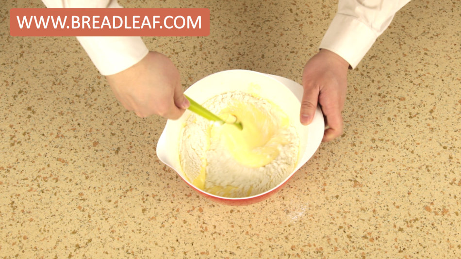 鸡蛋搅拌均匀后,面粉筛筛入低筋粉。然后用刮刀搅拌均匀。