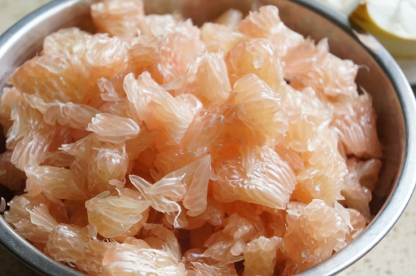 然后将柚子肉剥掉皮和白筋,只剩下果肉待用。满满一大盆,有1kg~