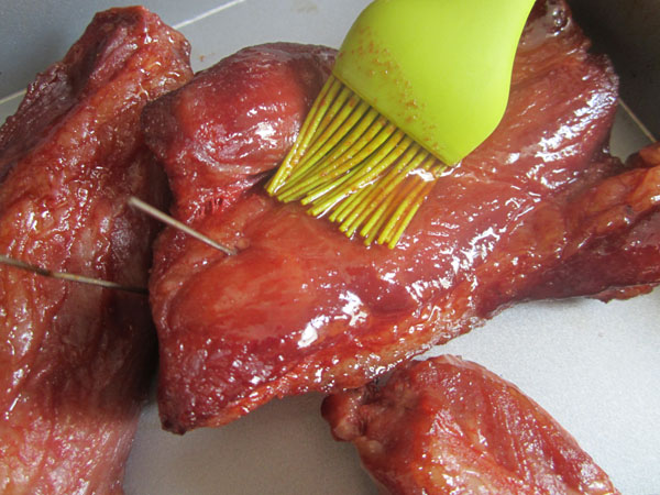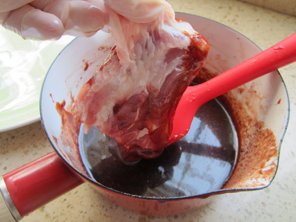 接着把腌肉剩下的一部分汤汁加入一小块麦芽糖,煮至起泡。冷却。作为刷酱~