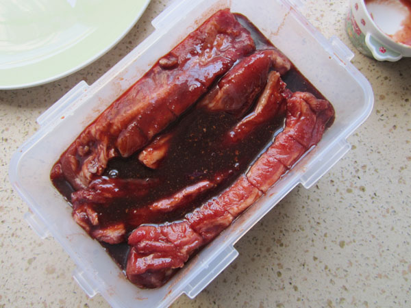 如果用盆子,汤汁最后会留到底部,上面的肉肉就不容易腌入味。因为偶是懒人,也不会时不时的把它拿来翻一下。还有个办法,就是用塑料袋把肉包起来,效果也不错哟。我还买了点肋排,一起腌起来。最后把剩下的所有汤汁倒进去。冷藏至少一晚,最好24小时以上才入味!