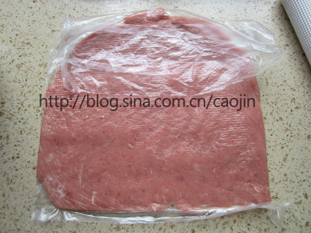 然后装入一个食品袋,擀平。摊开的肉糜冷却冻结更快。