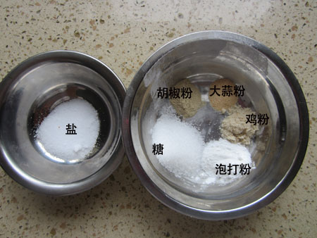 砂糖:12g 鸡粉:2g 胡椒粉:1g 大蒜粉:1g 泡打粉:3.5g 玉米淀粉:12g 芝麻油:一点点没称重