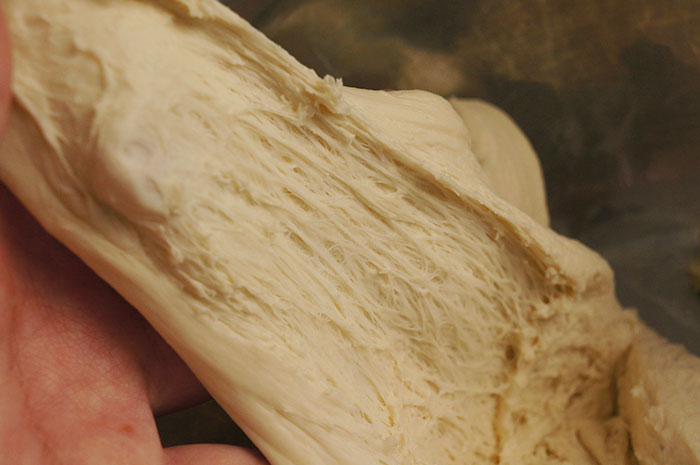 揉到面筋扩展再加入黄油和黑芝麻粉,揉到能拉出大片薄膜的完全阶段。