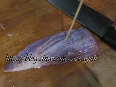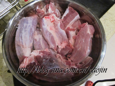 然后把肉放入水里,泡1-2小时,泡出血水。为了方便,我把切了大块。