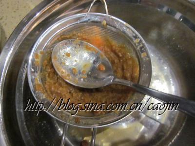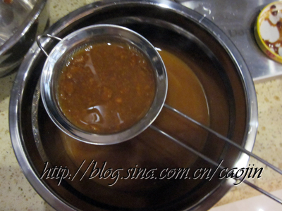 用滤网滤出酱渣,酱渣不要。酱汤留下。ps不吃辣可以不放郫县豆瓣,我是那种人