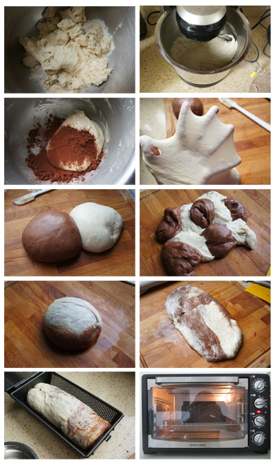 3,将面团一分为二,将可可粉揉入其中一个面团中。